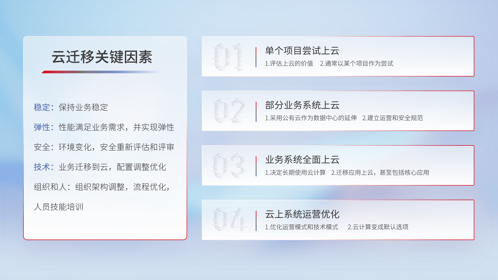 结合实际业务,,从规划设计、、、云平台选型、、云原生改造、、数据迁移、、、集成交付,,迁移全过程为客户识别最佳上云路径,,做好风险识别管理,,设计网络架构、、身份权限、、、、安全审计合规、、操作审计、、、、日志审计、、、、监控告警策略、、、多站点容灾设计等,,,,对云上基础设施进行整体规划,,提升IT治理水平,,以满足弹性、、、高可用、、、高性能的需求。。。