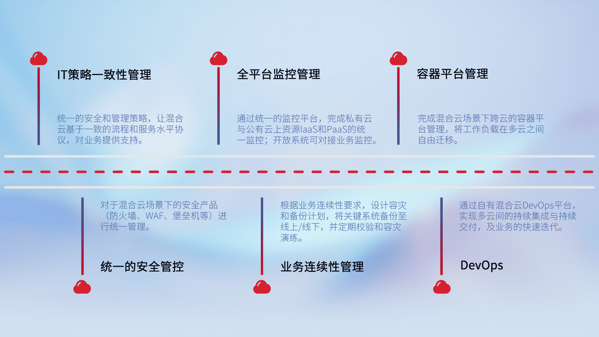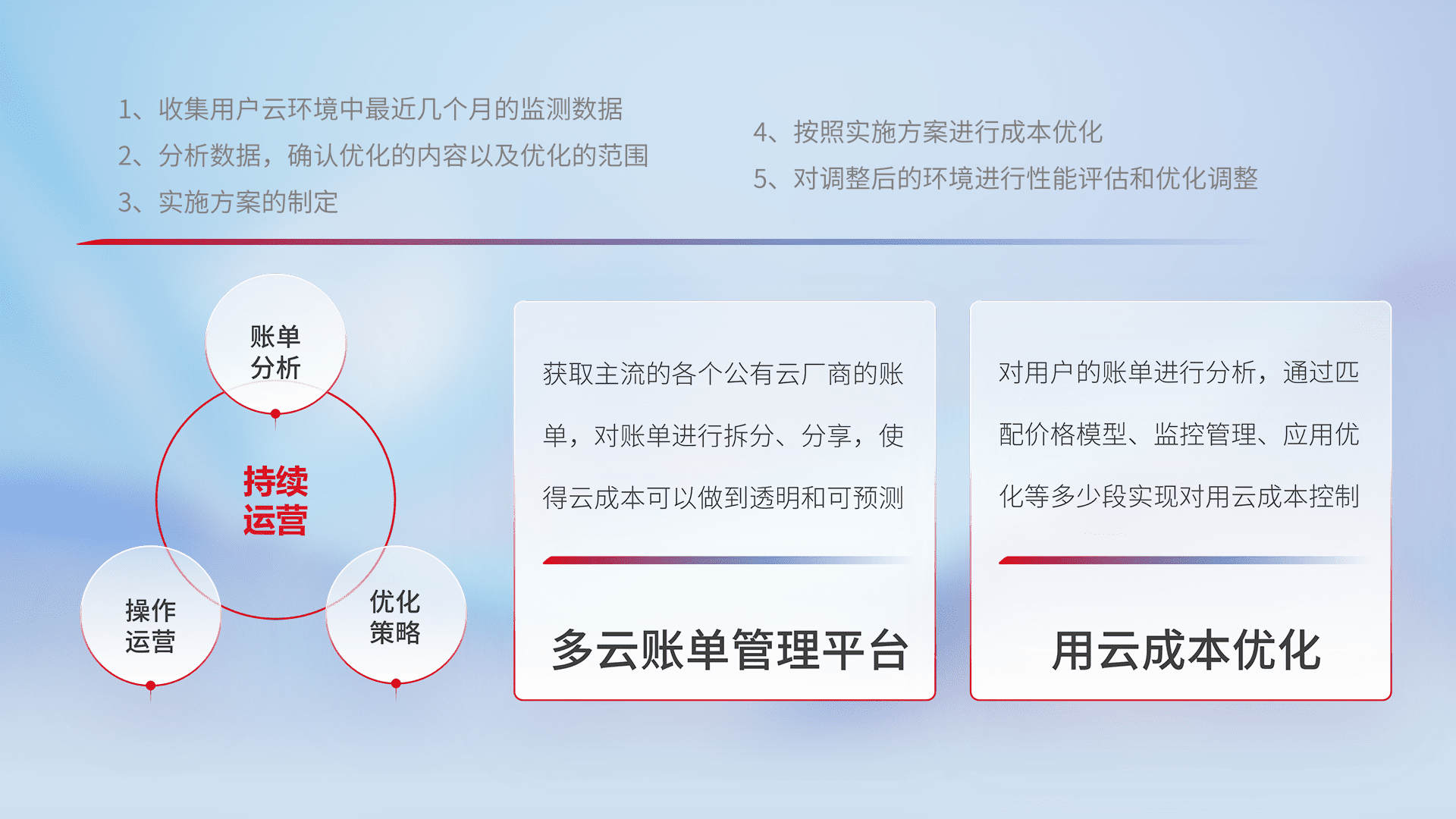 通过多云纳管,,,以统一的资源数据模型把客户的云资源进行抽象和封装,,,进而实现对多云资源的统一操作,,,,保障云资源管理的可靠性、、、稳定性与可用性。。。。量身定制化运维内容,,,配置、、、开发运维、、、补丁管理、、、备份、、、、监控、、、、认证和访问管理、、、审计和日常巡检等,,保障在用云过程中的可靠度,,稳定度以及高可用率。。