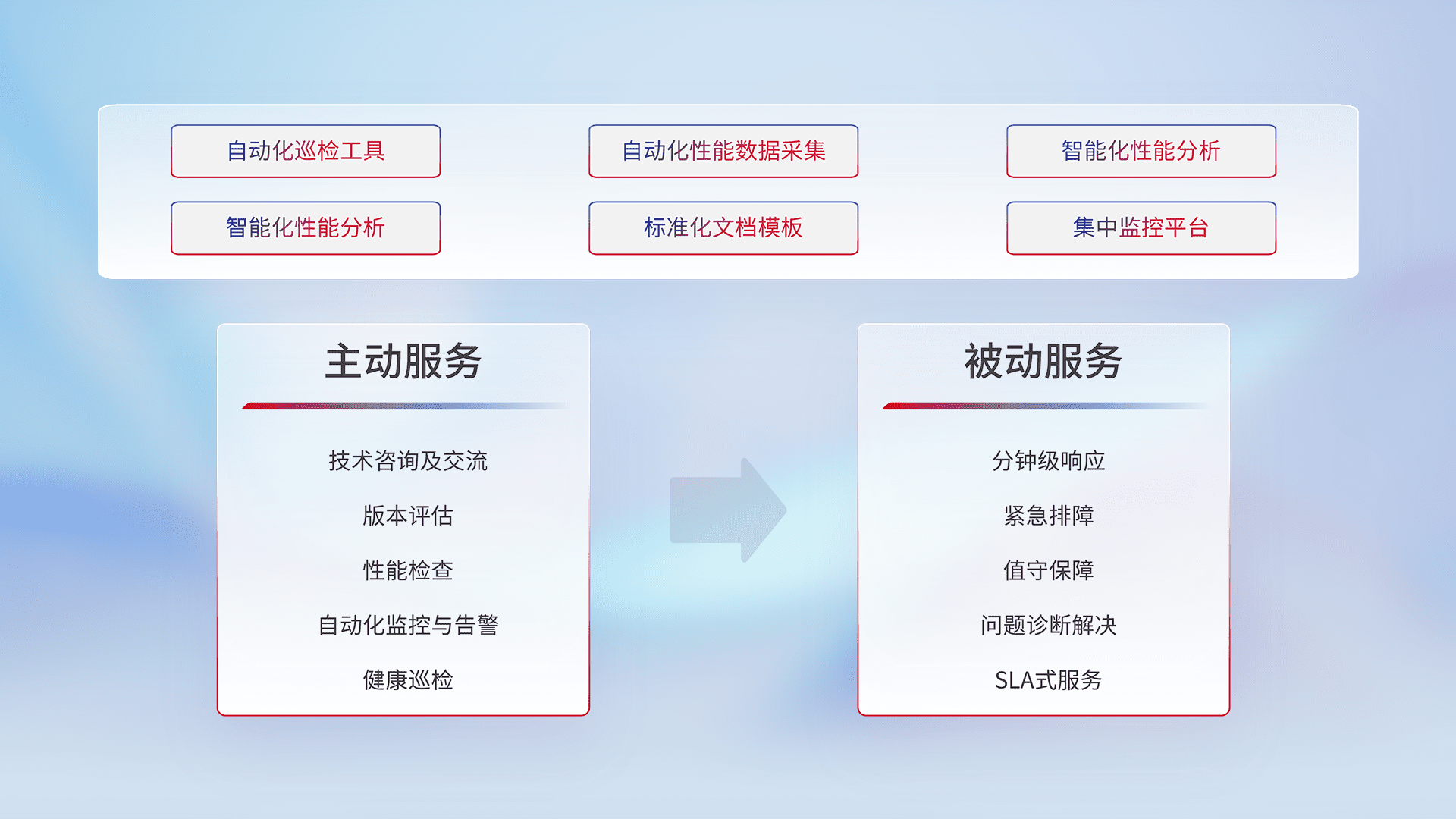 智能化工具和标准化文档,,,保障服务质量,,提供主动服务(包含技术咨询、、版本评估、、、、性能检查、、、、自动化监控与告警、、健康巡检)和被动服务包含(分钟级响应、、、紧急排障、、值守保障、、、问题诊断解决、、、SLA服务)。。。